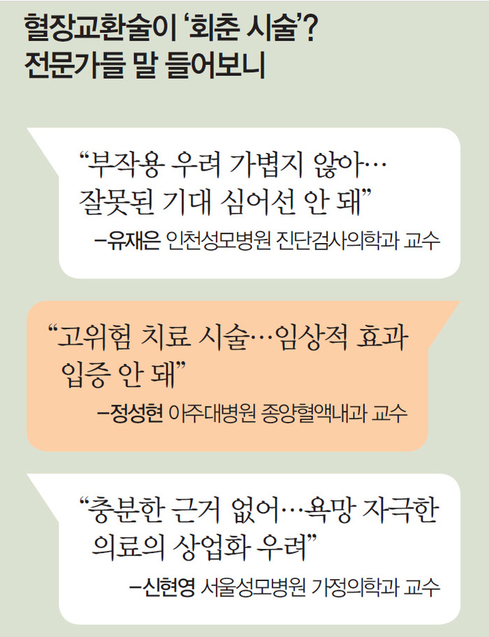 이를 두고 전문가들은 우려 섞인 시선을 내비친다. ① 과학적 근거가 부족한 데다 ② 고위험 시술로 위험성이 높고 ③ 부작용 우려까지 있어서다. 유재은 인천성모병원 진단검사의학과 교수는 “현시점에서는 노화 방지 목적의 혈장교환술을 권하지 않는다”며 “정당한 의료 행위로 포장돼 사람들에게 잘못된 기대를 심어주는 것 자체가 문제”라고 지적했다.