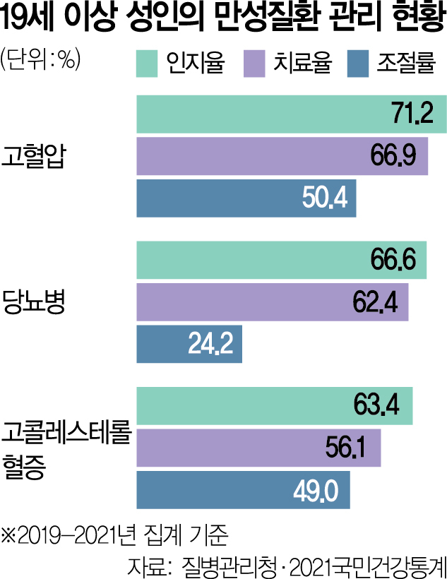 이처럼 만성질환은 약만으로는 효과적으로 관리하기 어려우며 생활습관까지 함께 바꿔야 하는 질환이다. 질병관리청 ‘2025 만성질환 현황과 이슈’에 따르면 2024년 만성질환으로 인한 사망자는 28만2716명으로 전체 사망의 78.8%를 차지했다. 특히 혈압·혈당·콜레스테롤 수치가 치솟는 이른바 '3고(高)' 문제가 건강수명을 단축하는 취약점이다.