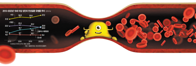 고콜레스테롤혈증 유병률은 2013년 12.3%에서 2023년 20.9%로 10년 사이 약 1.7배 급증하며 만성질환 중 가장 가파른 상승세를 보였다. 고콜레스테롤혈증은 혈중 저밀도지단백콜레스테롤(LDL-C) 또는 중성지방이 높거나 고밀도지단백콜레스테롤(HDL-C)이 낮은 상태다. 평소 아무 증상이 없어 가볍게 넘기기 쉬운데, 혈관 벽에 지방이 쌓여 동맥경화가 진행되면 심근경색·뇌졸중 위험도 올라간다. 이상지질혈증이 ‘조용한 시한폭탄’으로 불리는 이유다. 질병청에 따르면 고콜레스테롤혈증으로 월 20일 이상 꾸준히 투약한 환자 가운데 총콜레스테롤 수치가 정상 범위인 200㎎/㎗ 미만으로 조절된 비율은 86.2%에 달했다. 약만 잘 먹으면 대부분 혈관 건강을 회복할 수 있다는 의미다. 그런데도 치료율은 절반 수준인 56.1%에 그쳤다. 자신이 환자임을 아는 인지율도 63.4%에 불과해 인식 개선이 시급하다.